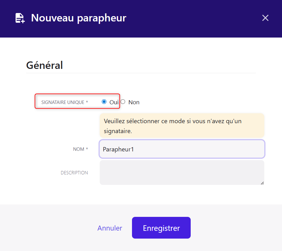 Sélectionner "Oui" pour le mode signataire unique puis renseigner le nom du parapheur.