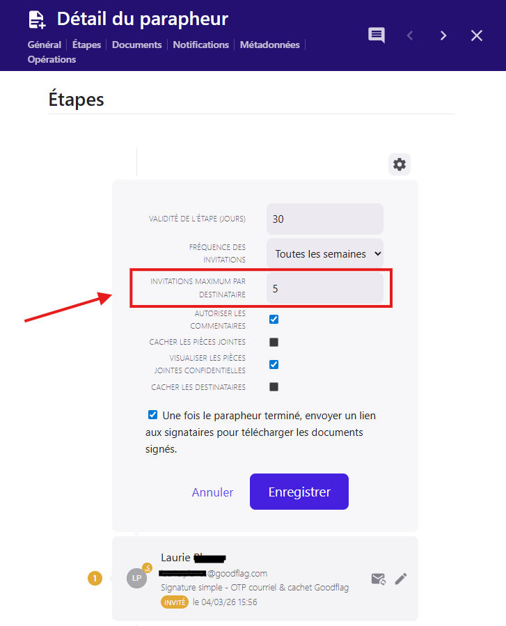 A noter : il y a un nombre d’invitations maximum par destinataire. Il est possible de modifier ce paramètre en cliquant sur la roue crantée au dessus de l’encart du signataire/validateur concerné