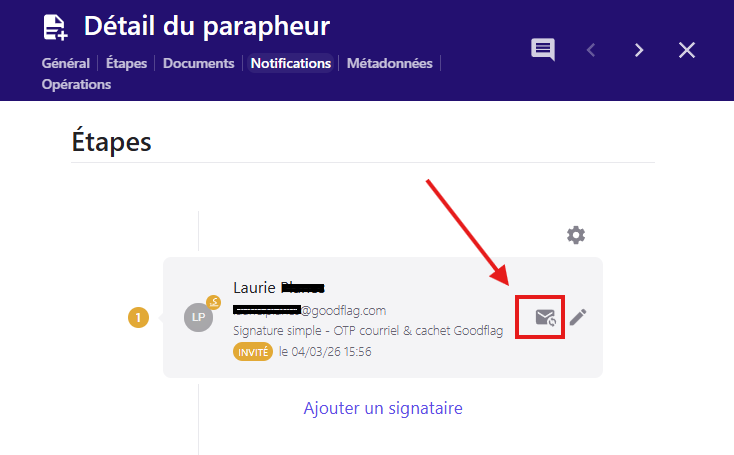 Scroller jusqu'à la section Etapes, et cliquer sur l’icone Enveloppe située dans la partie droite de l’encart du signataire :