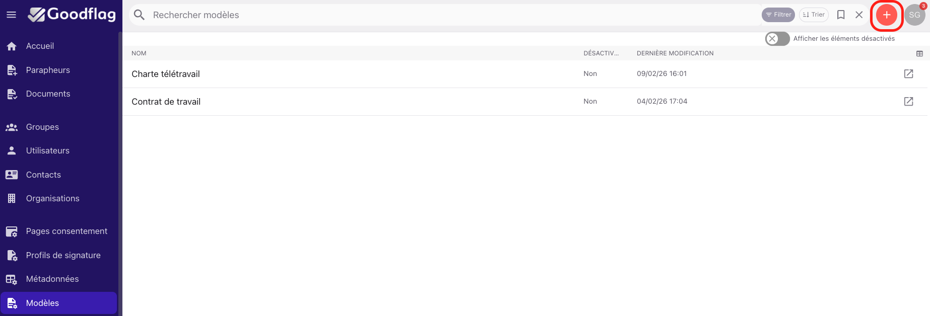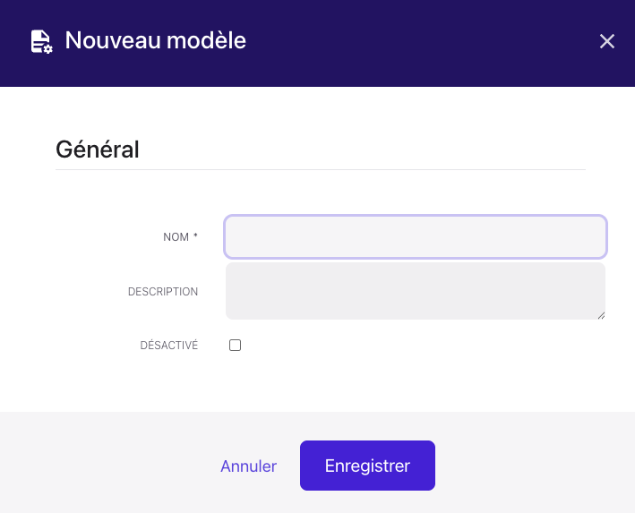 La case à cocher "Désactivé" permet à l'administrateur de désactiver un modèle.