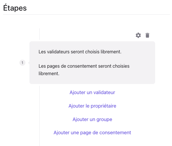 Pour chaque étape paramétrée, l'administrateur peut ajouter des paramètres tels que :