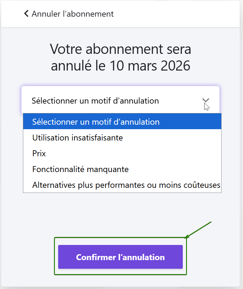 6. Pour terminer, choisissez le motif de l’annulation et confirmez l’annulation :