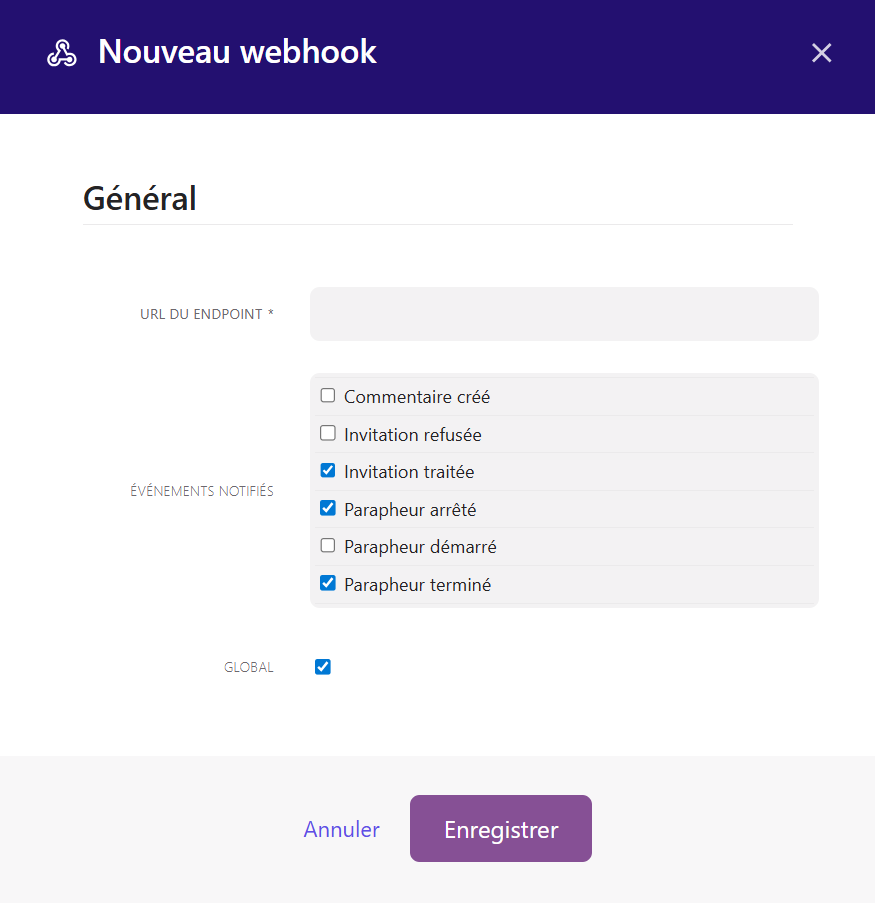 Si la case "GLOBAL" est cochée, cela veut dire que les notifications concernent tous les parapheurs du tenant, sinon, cela concernera uniquement les parapheurs dont l'utilisateur qui a créé le webhook est gestionnaire.